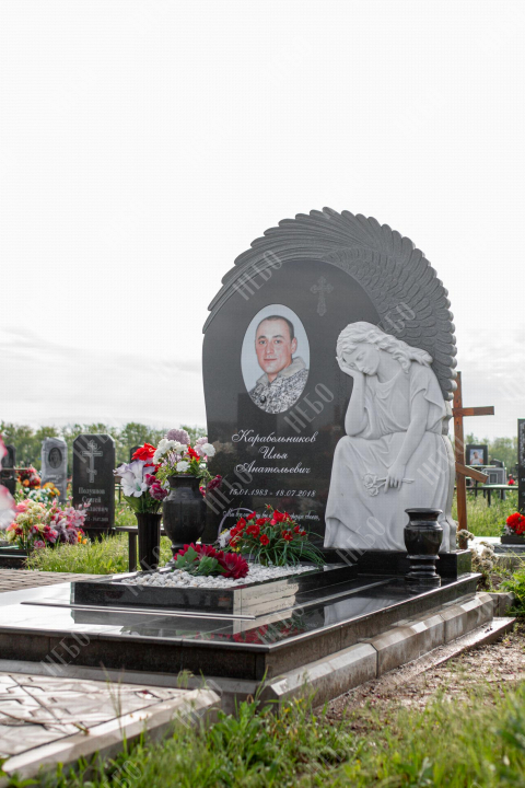 Памятник фрезерный с фигурой ангела и открытым надгробием. Использование фрезеровки в изготовлении ритуальных изделий гарантирует высочайшую точность исполнения запланированного дизайна. С помощью этой технологии в камне высекаются углубления по заданным макетам, придавая памятнику объем, позволяя комбинировать различные элементы и создавать сложные фигуры. На фрезерованном памятнике удачно контрастируют цвета и в солнечную погоду играют тени от объемных деталей. Размеры стелы и надгробия соответствуют заданным нормам при имеющейся нагрузке и исключают деформации изделия со временем.