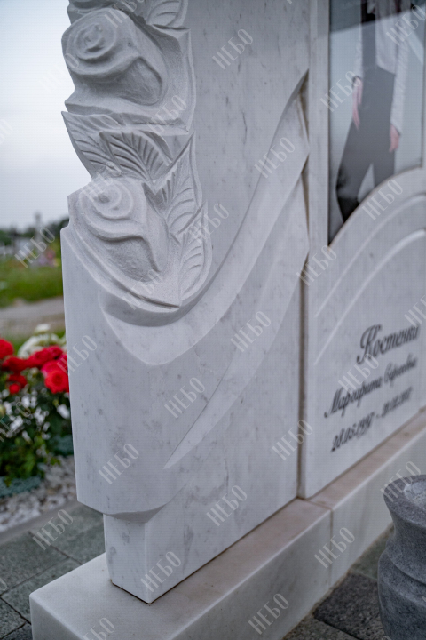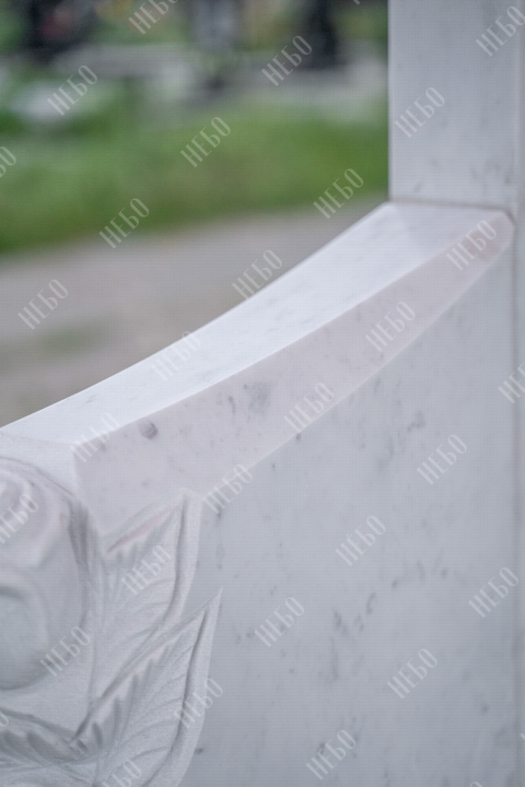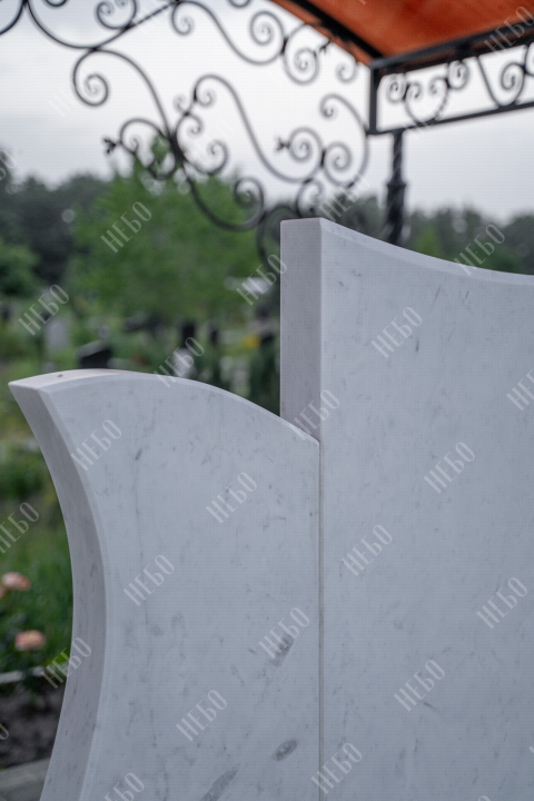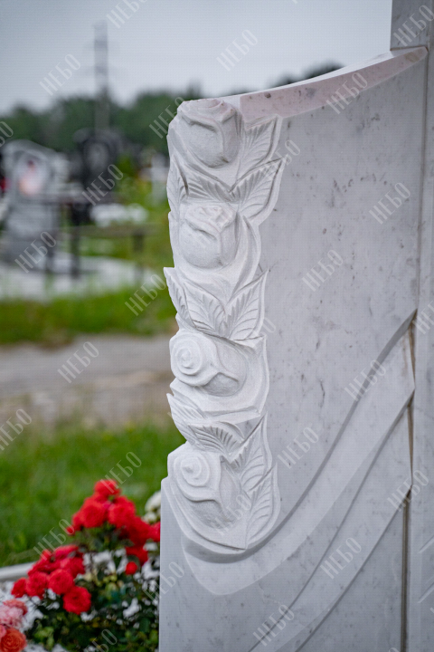 Ассиметричный фрезерный памятник с широкой стелой и закрытым надгробием. Ритуальное изделие выполнено в светлых оттенках и отличается эксклюзивным дизайном стелы. Вертикальная плита визуально разделена на три части и сочетает в себе легкость ассиметричных линий и фрезерные элементы в виде цветов. С помощью фрезеровки в камне высекаются углубления по заданным макетам, придавая памятнику объем, позволяя комбинировать различные элементы и создавать сложные фигуры. Закрытое надгробие упрощает уход за ритуальным изделием и позволяет расположить эпитафию, сделав на ней акцент. Размеры памятника и соотношение объемов стелы к надгробию проработаны специалистами с учетом имеющейся нагрузки и визуального восприятия. Такой подход гарантирует долговечность и исключает искажения памятника.